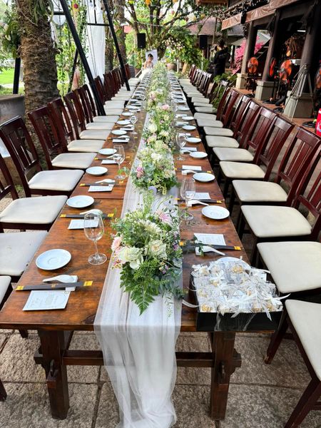 - Bàn tiệc dài phủ hoa, sang trọng mà gần gũi, nơi người thân và bạn bè cùng chia vui.