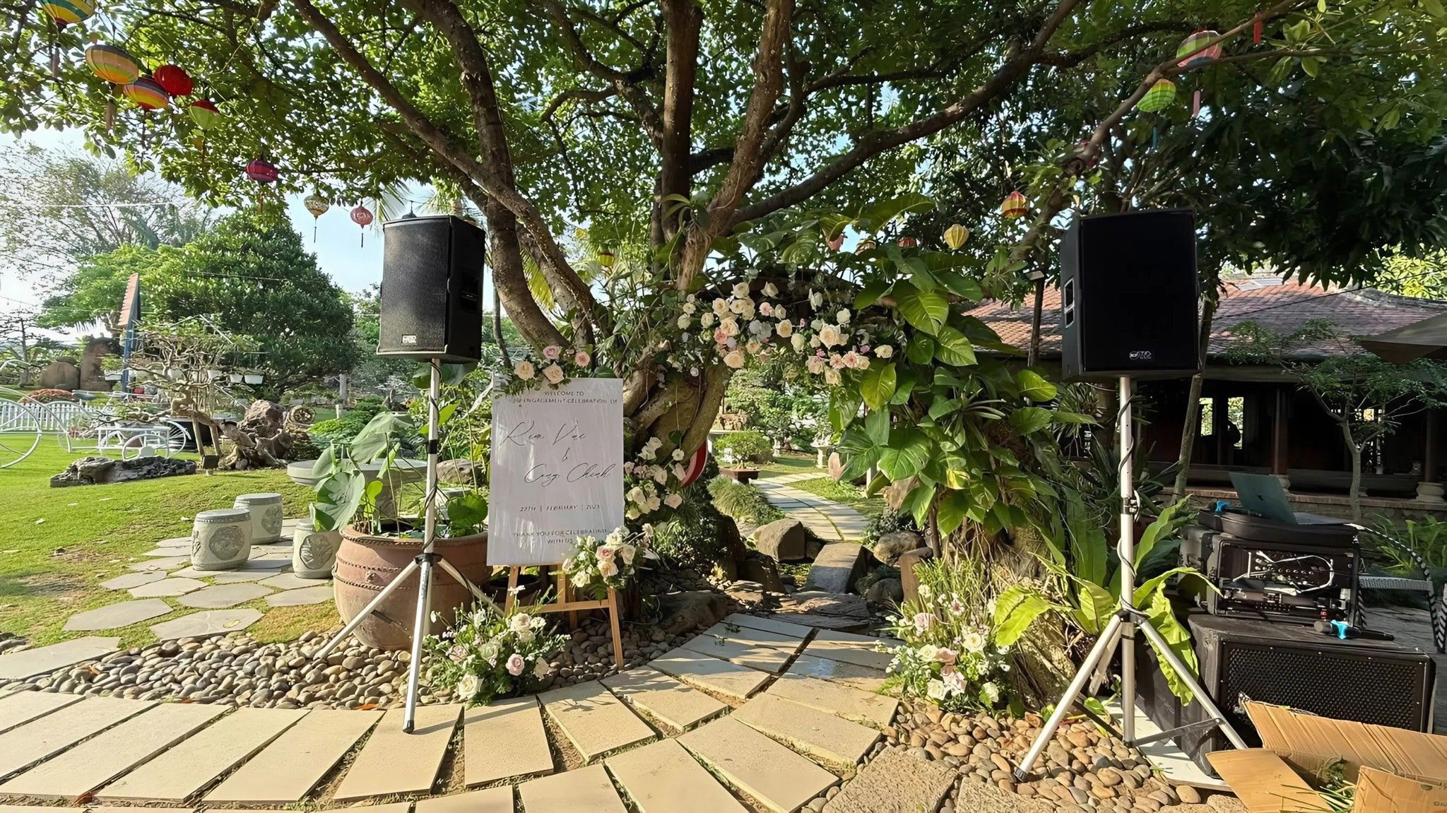 - Không gian vườn xanh mát cùng mái ngói cổ kính làm nền cho khung cảnh cưới nên thơ.